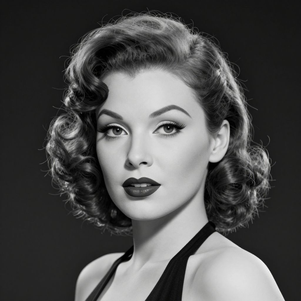 Black-and-white digital portrait of a 1940s-style woman with curly, shoulder-length hair, dark lipstick, and a black halter top,
