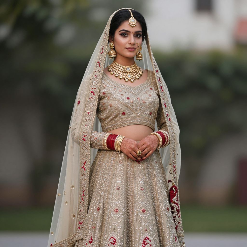 Photograph of an Indian bride in a traditional beige and red embroidered lehenga, veil, and gold jewelry, standing outdoors with a blurred green background.
