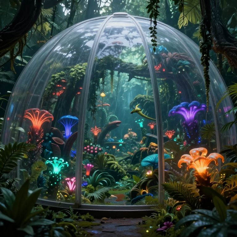 This digital fantasy artwork depicts a lush, vibrant forest scene encased in a large, transparent dome. Inside the dome, colorful, glowing mushrooms of red, blue, purple, and orange illuminate the dense, green foliage. Various exotic plants and ferns surround the dome, creating a rich, jungle-like atmosphere. A small, yellow bird perches on a branch inside the dome, adding a sense of life and movement. The background reveals a misty, sunlit forest extending beyond the dome. The dome's transparent material allows light to filter through, enhancing the vivid colors and mystical ambiance of the scene.