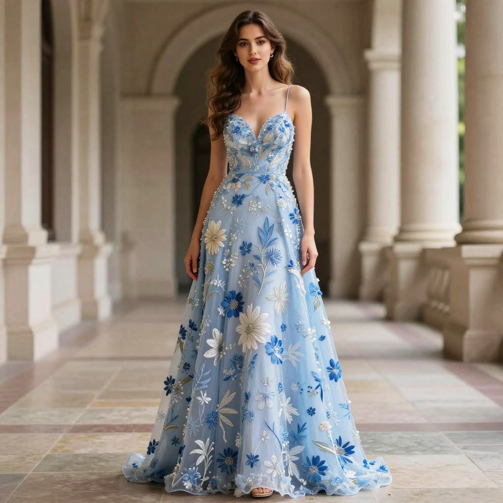 Photograph of a slender, young woman with long, wavy brown hair and fair skin, standing in a sunlit, colonnaded hallway. She wears a light blue, floor-length, strapless gown with a sweetheart neckline, adorned with large, white and blue floral embroidery. The gown's fabric is sheer with a soft, flowing texture. The hallway features tall, white columns and a tiled floor with a geometric pattern. Natural light filters through the arches, casting gentle shadows. The woman's expression is calm and composed, and she stands with a relaxed posture. The overall style is elegant and sophisticated.