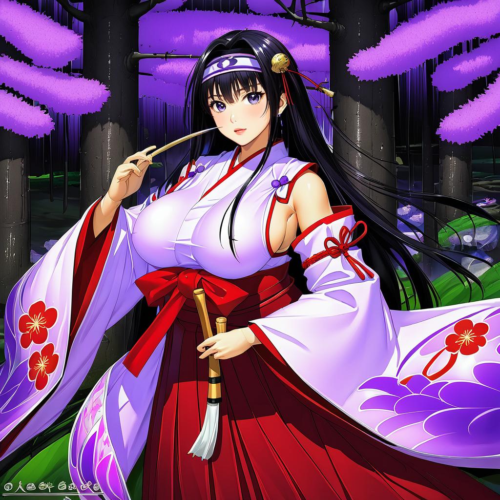 Musha miko tomoe, queen's blade, 1girl, purple eyes, black hair, long hair, large breasts, hakama skirt, miko, miko, headband, red hakama, by artist gao (gaolukchup), anime