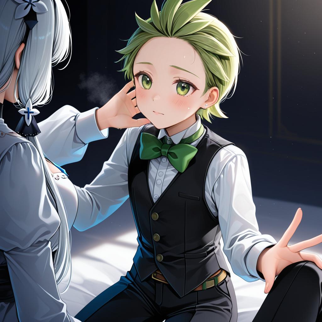 Anime-style digital artwork featuring a young boy with short green hair and green eyes wearing a white long-sleeve shirt, black vest, black pants, and a green bowtie. The boy has a gentle expression with a slight blush and sweat drops, sitting indoors with soft lighting. The image includes another character with long white hair dressed in white attire, partially visible.