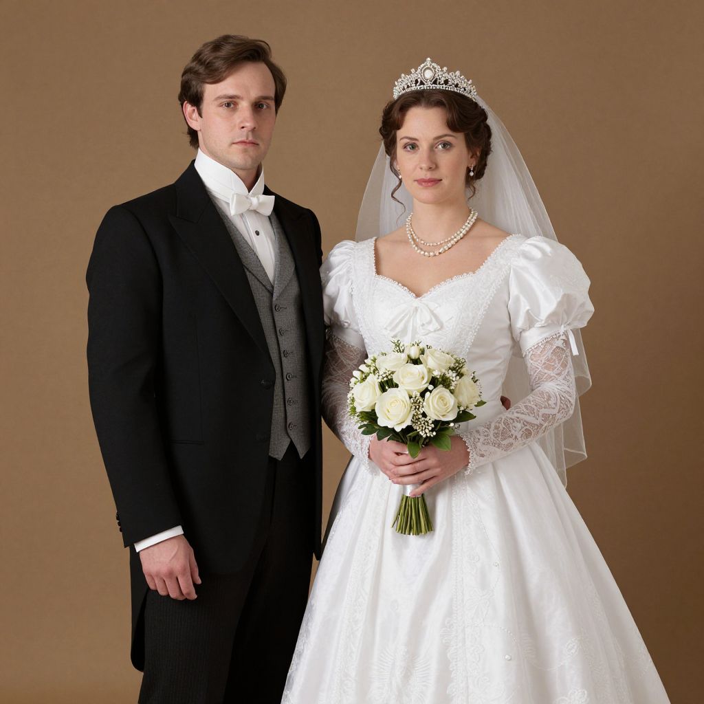 Elegant Victorian attire graces a scene where a man in a formal black suit stands beside a woman in a pristine white wedding gown adorned with a tiara, bouquet, and pearl necklace, evoking the timeless imagery of Miss Havisham from Charles Dickens's *Great Expectations*.