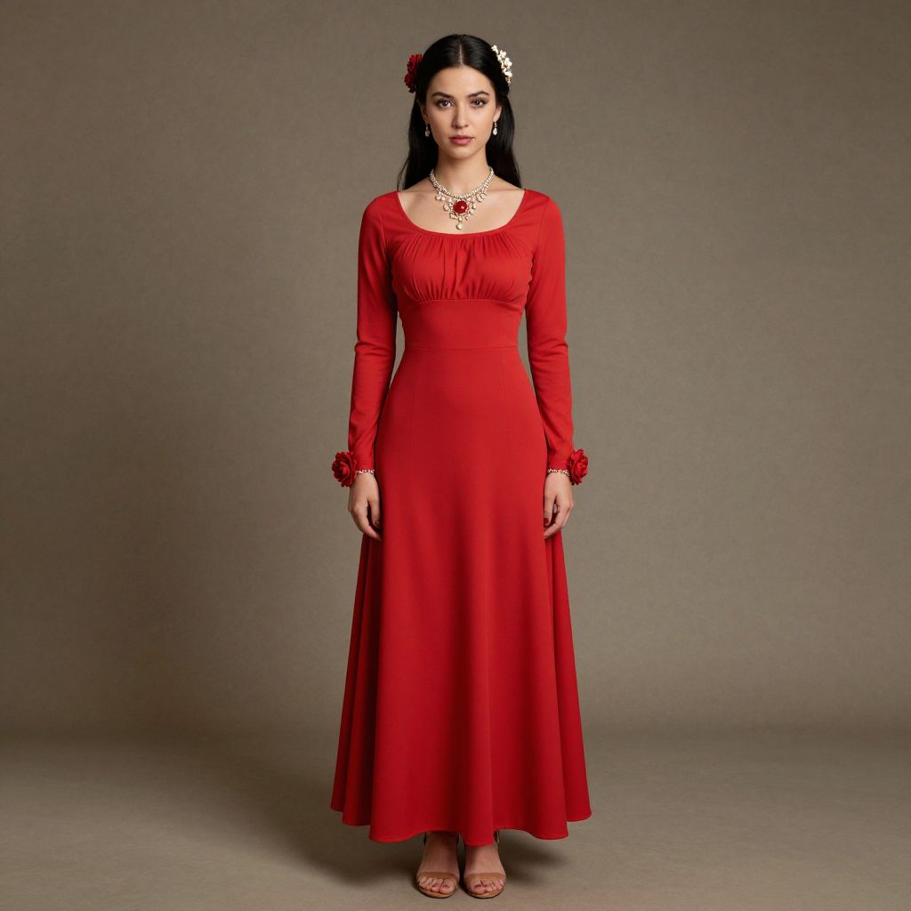 Photograph of a young woman with pale skin and long black hair, styled with a small white flower headpiece. She wears a vibrant red, long-sleeved, full-length gown with a square neckline and subtle ruffle details on the sleeves. She accessorizes with a red necklace and matching red bracelet. Her expression is neutral, and she stands against a plain, gray background. She wears nude-colored, open-toe sandals, and the image has a soft, studio lighting that highlights the dress's rich color and smooth fabric texture.