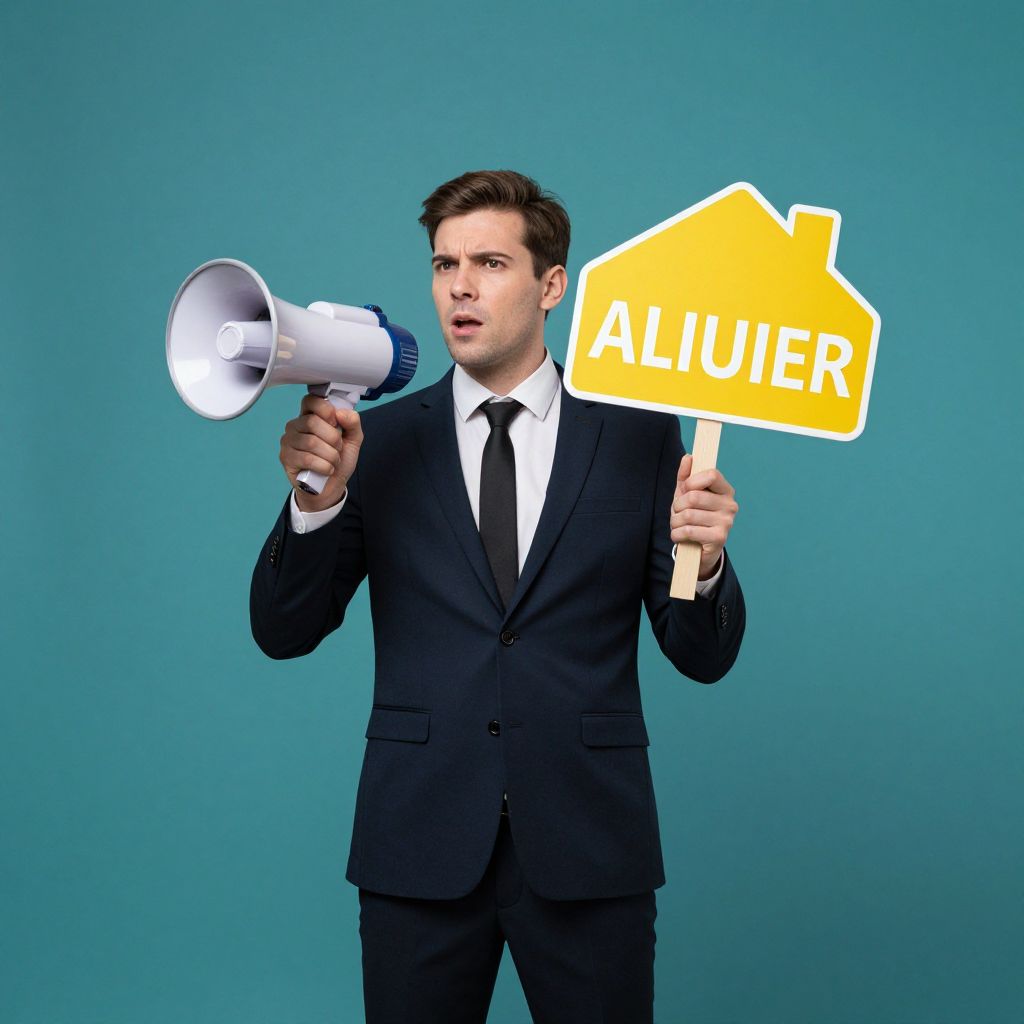 In the image, a man dressed in a dark suit and tie stands confidently, holding a megaphone in his right hand and a sign in his left. The sign is rectangular with a rounded top, featuring the word \"ALIULIER\" in bold, white letters. A small house icon is depicted at the top of the sign, suggesting a real estate context. The man's expression is serious, and his posture is upright, indicating he is likely addressing an audience or making an announcement. The background is a solid teal color, providing a stark contrast to the man's dark attire and the sign's vibrant yellow. The overall composition is balanced, with the man centrally positioned and the sign slightly to his right, creating a clear focal point. The megaphone and sign are held close to the man's body, emphasizing their importance in the scene.