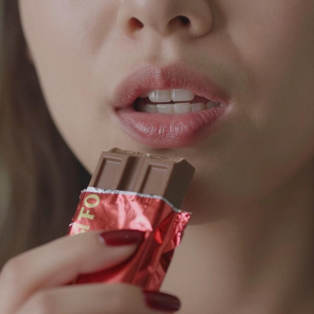 Photograph of a blonde woman with light skin, smiling while biting a large, square-grid chocolate bar. She has blue eyes, light makeup, and her hair is tied back. The background is blurred with a red and green color palette, suggesting a plant. The lighting is bright and even, highlighting her face and the chocolate. The camera angle is slightly above eye level, and the depth of field keeps her face and chocolate bar in sharp focus.