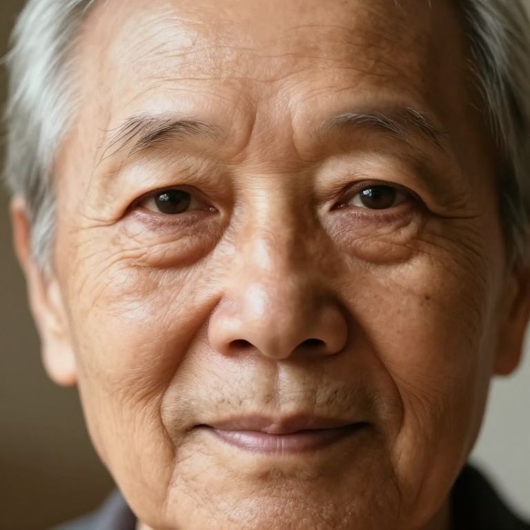 AI aging photo online free - a close-up of a diverse elderly face created using AI aging software online, emphasizing natural skin aging signs, detailed eye reflections, subtle smile, natural lighting with warm tones, hyper-realistic digital art