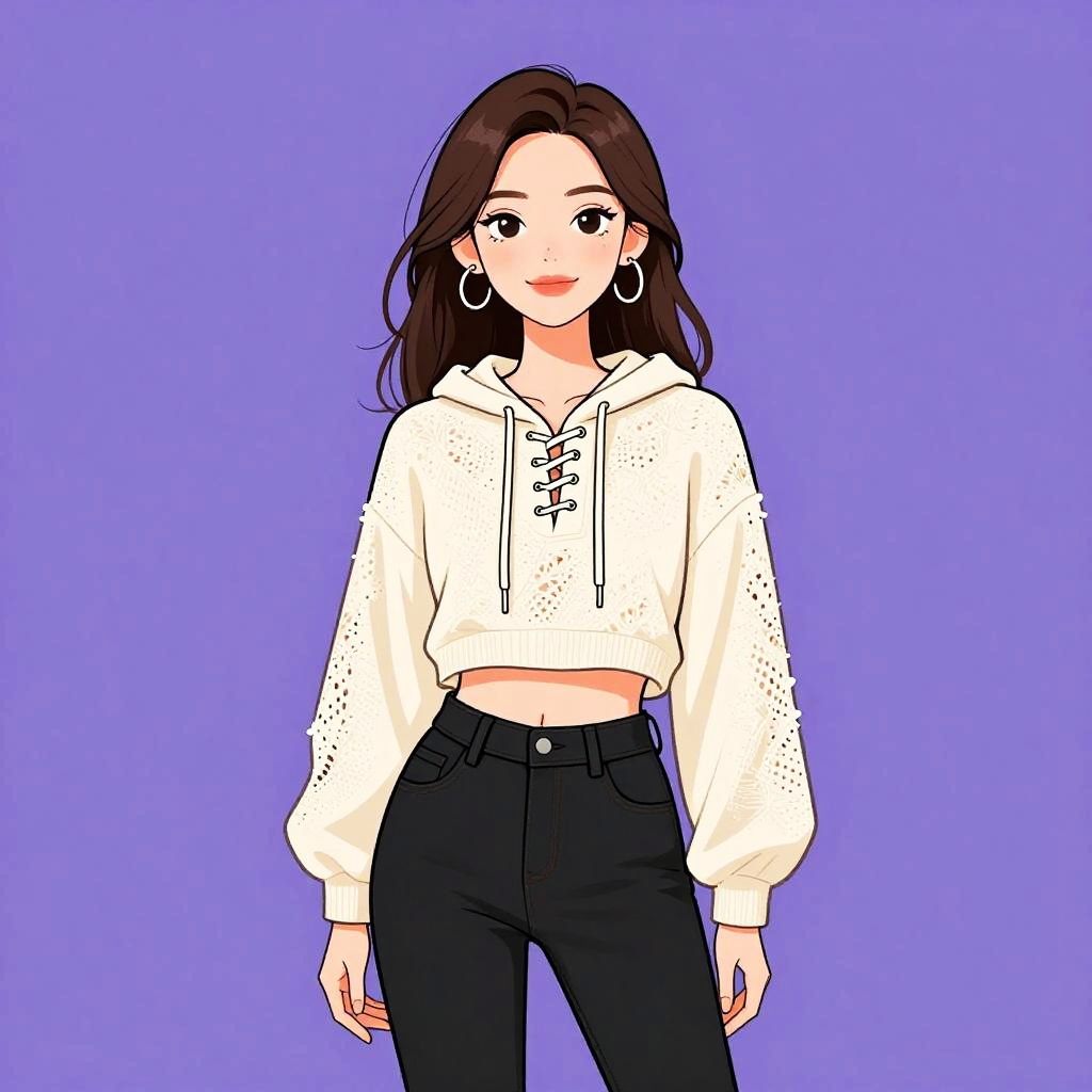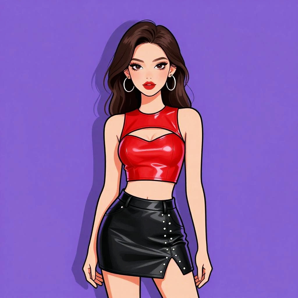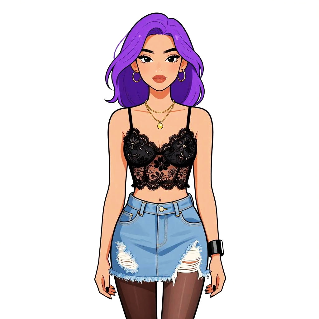Woman with pretty face and pretty hair. Woman, edgy streetwear, black tank top with metallic lettering, scoop neck, sleeveless, paired with black faux-leather leggings, high waist, fitted silhouette, minimal gold choker necklace. --sref 1461