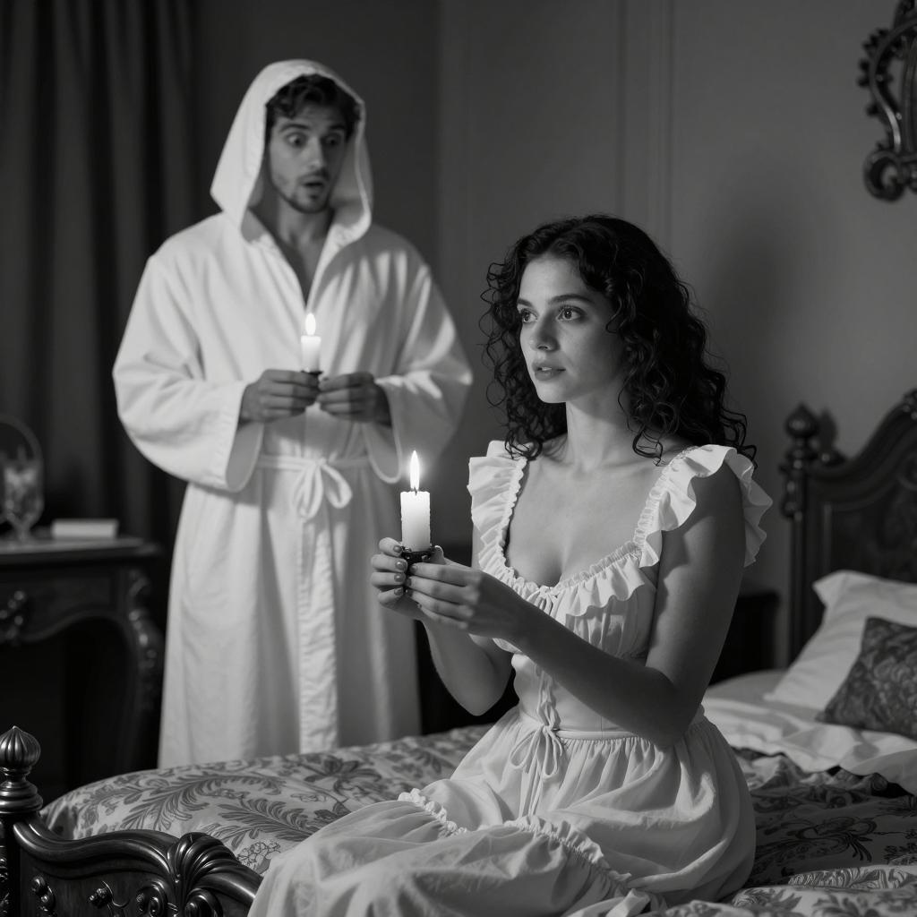 Blonde woman with curly hair, topless, wearing white lace skirt, standing in dimly lit, rustic room. Hands near face, slightly shy expression. Red table with white object on right. Candelabras on walls, round mirror on left, black cauldron with blue light in front. One wall has a large, worn-out painting. Dark, narrow hallway in background. Two wall-mounted candle sconces.