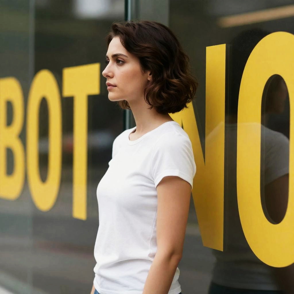Photograph of a woman with short, wavy brown hair standing in profile against a glass wall. She wears a white, slightly fitted t-shirt. Bright yellow letters are reflected on the glass. Her expression is serious and introspective. Soft light highlights her side and the reflection. She stands in the middle, with glass and yellow letters on both sides.