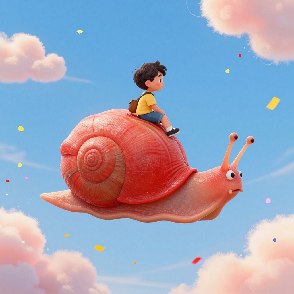 A whimsical digital illustration depicts a child riding a colossal crimson snail soaring through a vibrant sky dotted with fluffy clouds and confetti-like particles, evoking a dreamlike, fantastical atmosphere.