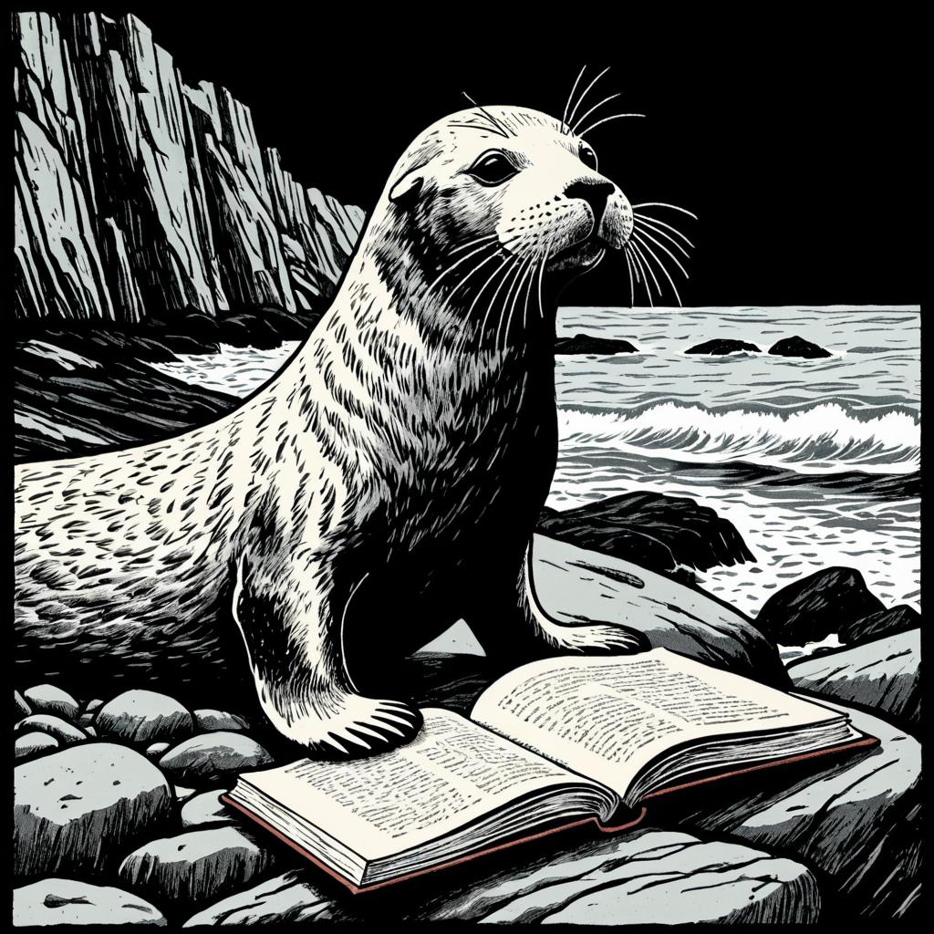 Low Angle A vintage-style illustration of a seal reading a book on a rocky shore, in soft colors, hand-drawn organic and crisp lines, the illustration should be isolated on a black background and ready to print on a shirt