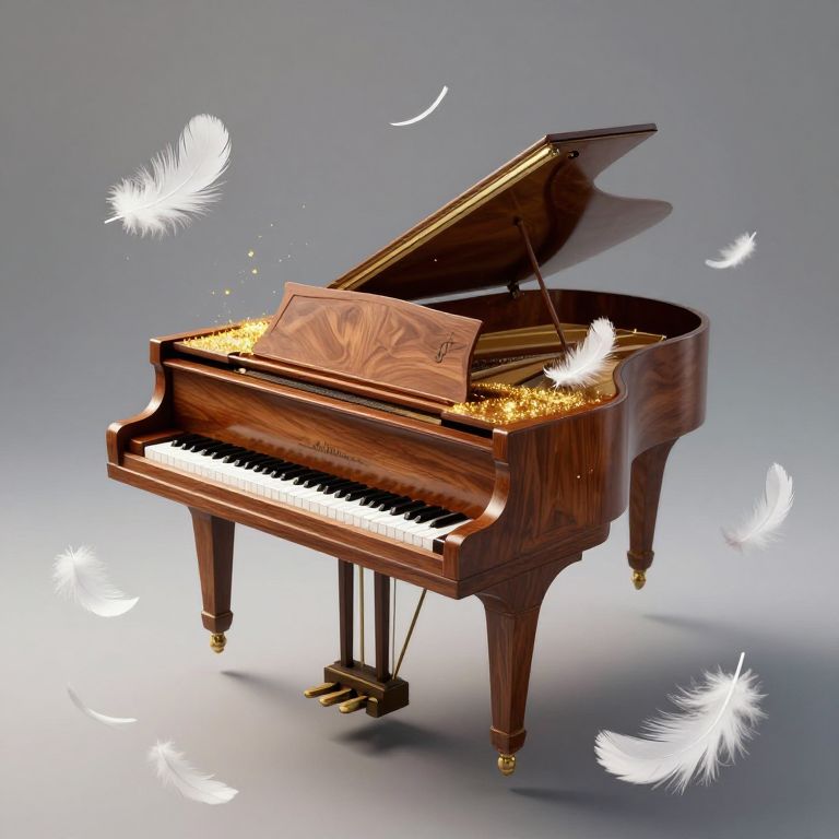 Photorealistic digital art of a wooden grand piano with glowing golden keys, surrounded by floating white feathers, against a gradient gray background.