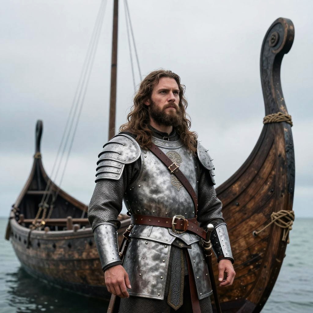 Photograph of a rugged, bearded man with long, wavy brown hair standing in front of a large, wooden Viking ship with a curved prow. He's wearing silver, medieval-style armor with a leather strap across his chest and a brown belt. The sky is overcast, and the sea is calm behind him, creating a dramatic, historical vibe.