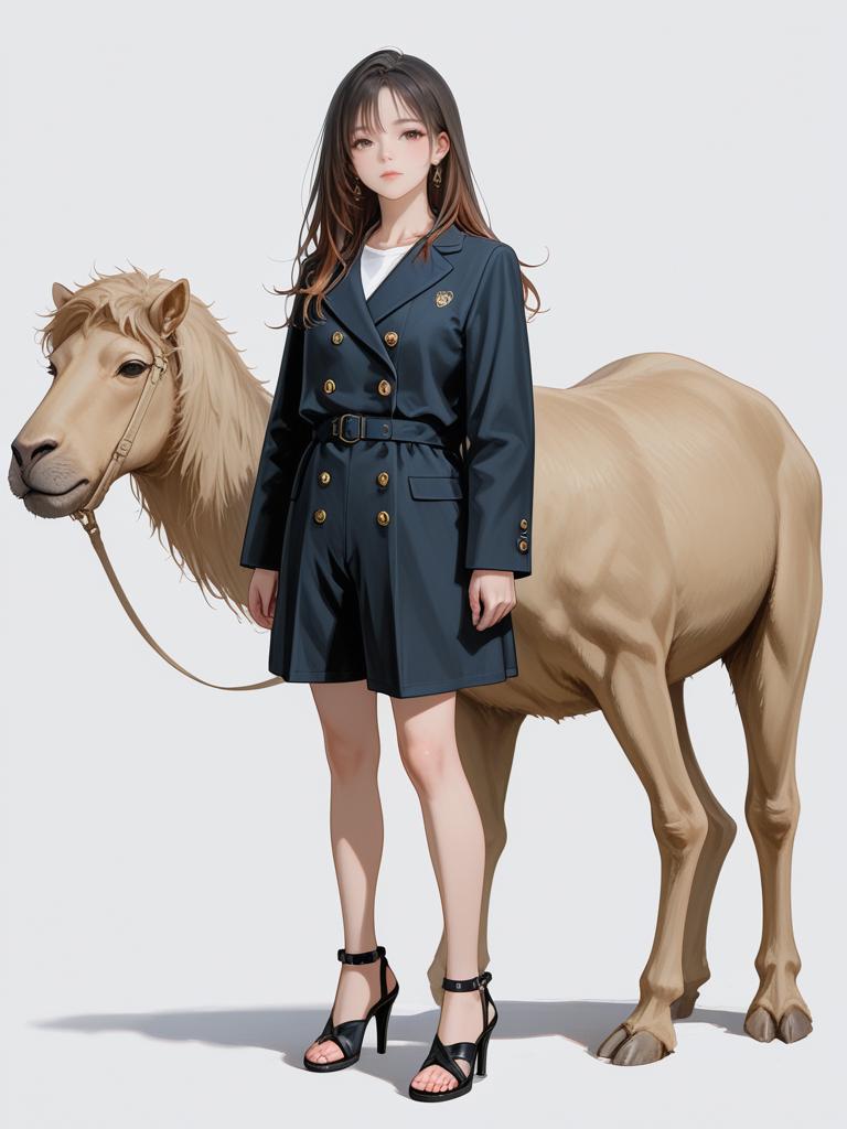 1girl, realistic face, full body shot, Woman, contemporary chic, oversized double-breasted blazer in camel color, large buttons, paired with black shorts, strappy high heel sandals, white background.