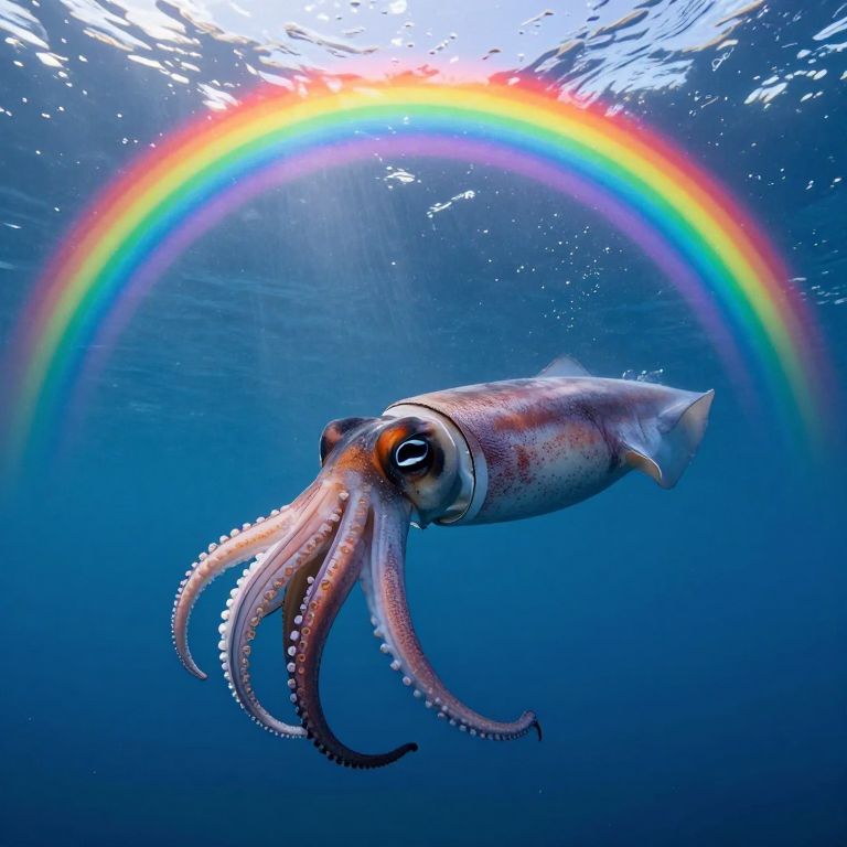 Photograph of a vibrant underwater scene featuring a large, detailed squid with orange and white patterns on its body and tentacles, swimming in deep blue water. Above, a vivid rainbow arcs across the top of the image, with sunlight filtering through the water's surface. The squid's eyes are large and expressive, and its tentacles are adorned with suction cups. The sunlight creates a glowing effect, highlighting the squid and the rainbow. The overall composition combines the natural beauty of marine life with a magical, rainbow-hued backdrop.