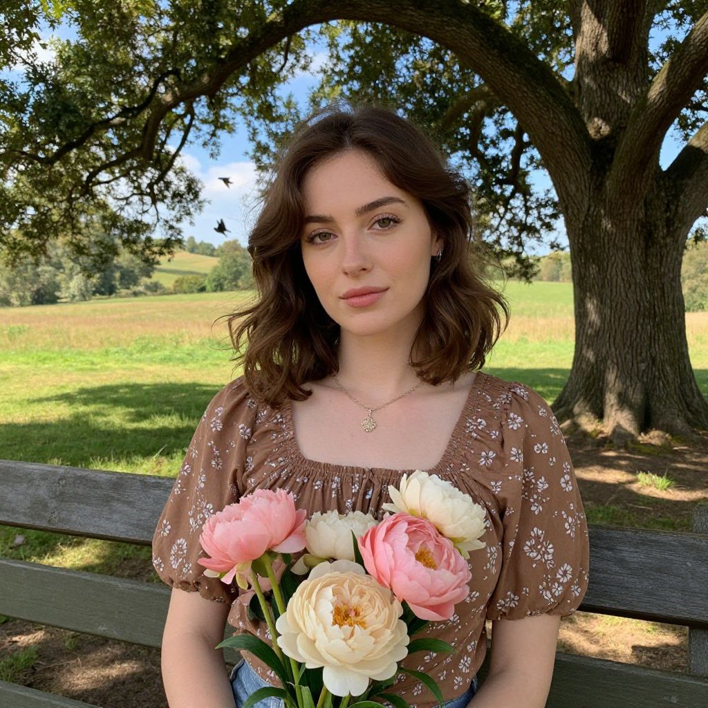 A serene outdoor portrait of a woman with olive skin and shoulder-length wavy hair in soft brown tones, wearing a comfortable brown floral top with delicate pink and cream peonies, sitting on a sunlit park bench beneath a large oak tree, with birds flying in the background and a gently rolling meadow.