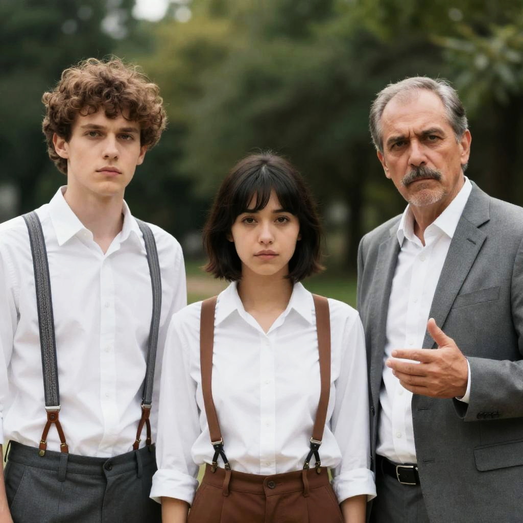 Three people outdoors. Young man with curly hair, white shirt, gray suspenders, serious expression. Young woman with short dark hair, white shirt, brown suspenders, neutral expression. Older man with mustache, gray suit, white shirt, gesturing with right hand, serious expression. Green trees in background.