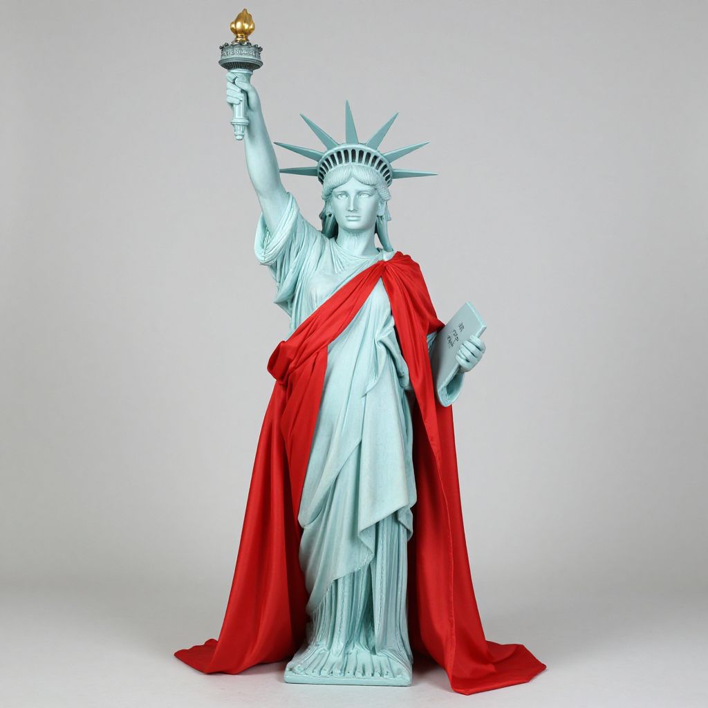 Photograph of a Statue of Liberty statue with a red cape, holding a torch with a golden flame, standing against a plain white background.