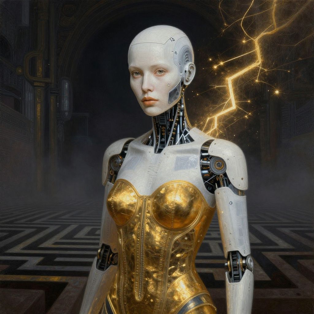Photorealistic CGI of a silver and gold robotic woman with exposed circuitry, lightning bolts, and a maze-like background.