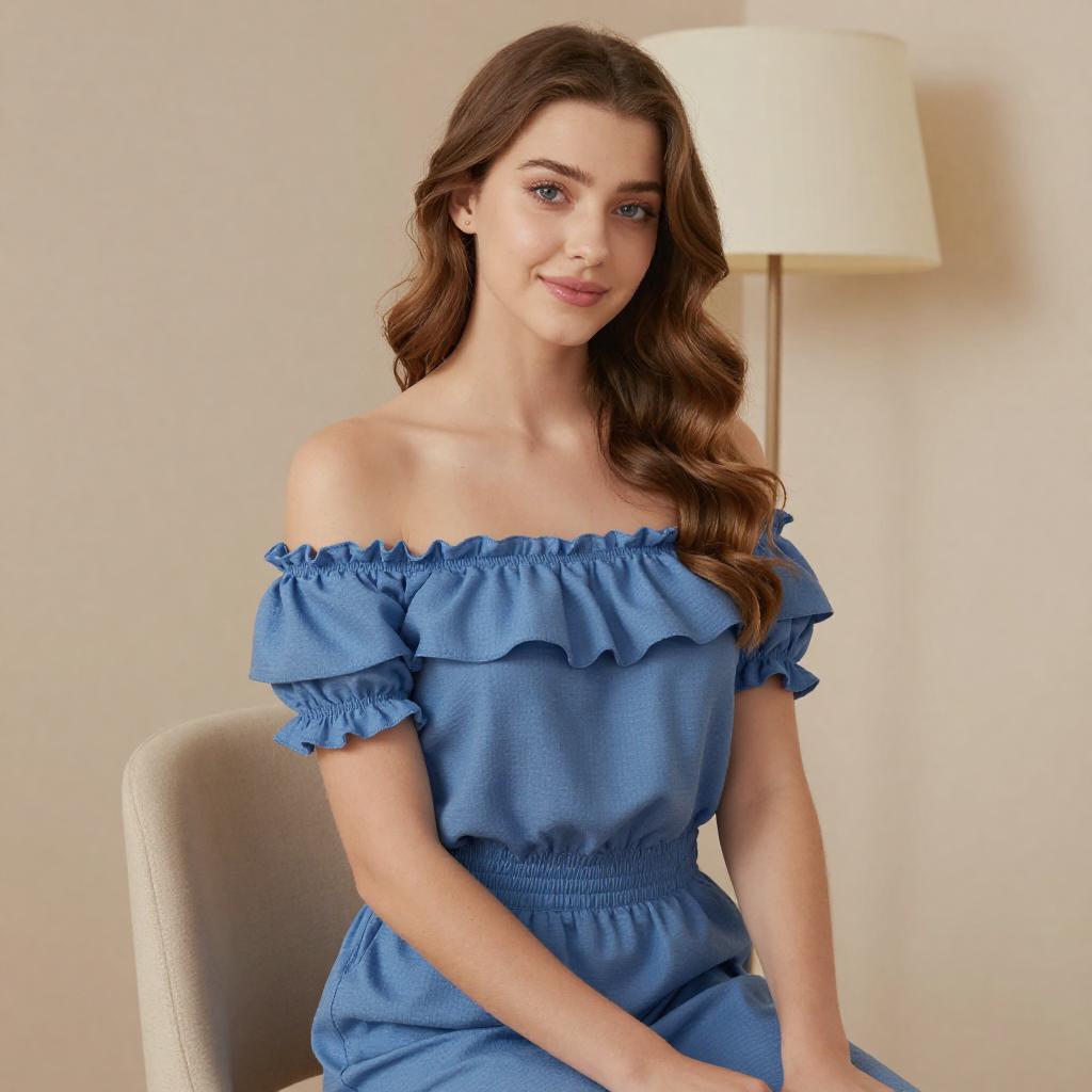 Photograph of a young woman with long, straight blonde hair, wearing a light gray, buttoned, long-sleeve jumpsuit and dangling earrings. She sits on a patterned purple chair, looking down at her hands, which are adjusting her hair. A wooden dresser with a black lamp and white shade is in the background.