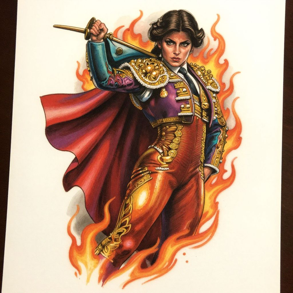 Spanish woman tattoo illustration showcasing a strong matador theme, colorful cape flowing, dynamic motion, ornate inkwork blending realism and surrealism, fiery reds and golds highlight muscular form, detailed facial expression, sharp shadows and highlights.