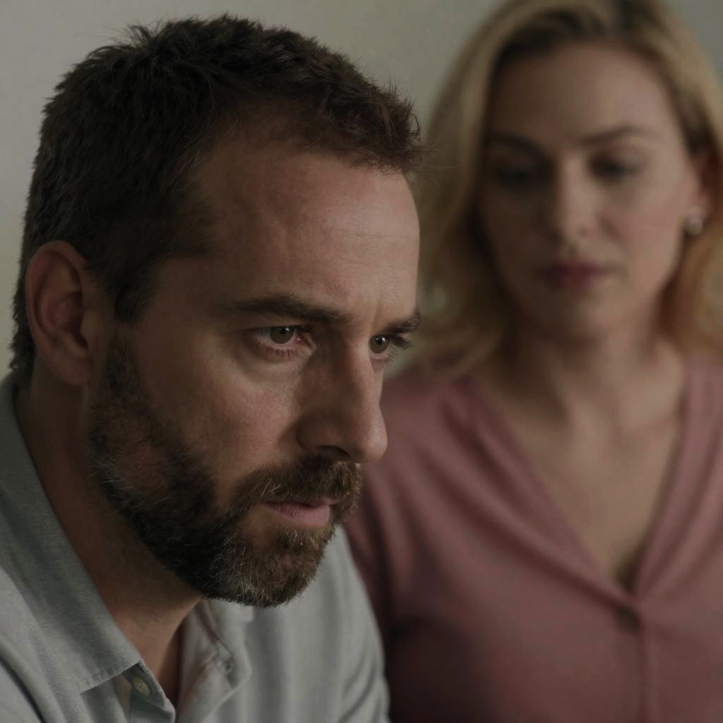 Photograph of a dimly lit scene featuring a bearded man with dark hair and a woman with blonde, wavy hair. Both are partially shadowed, with the man's face slightly obscured. The woman wears a dark scarf and coat, her expression serious. The background is black, emphasizing their faces and creating a mysterious atmosphere.