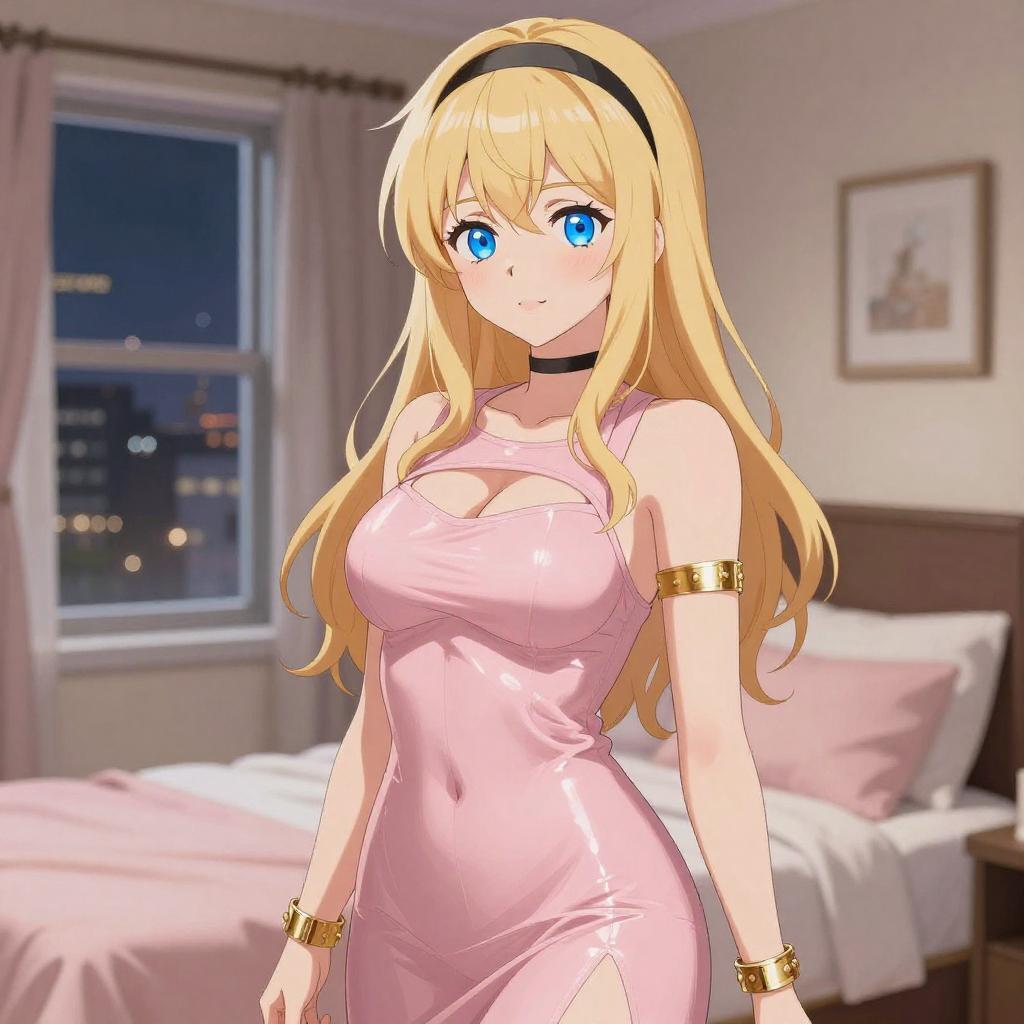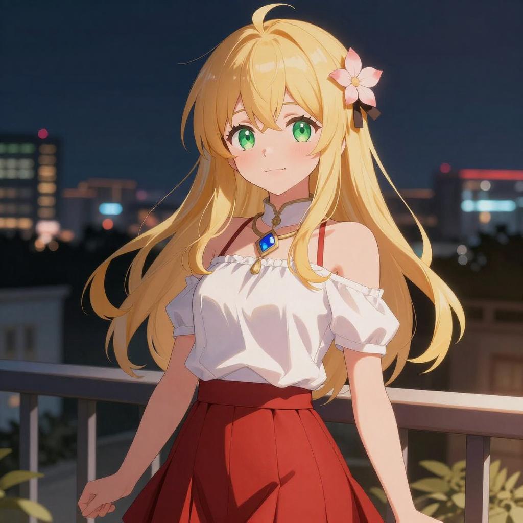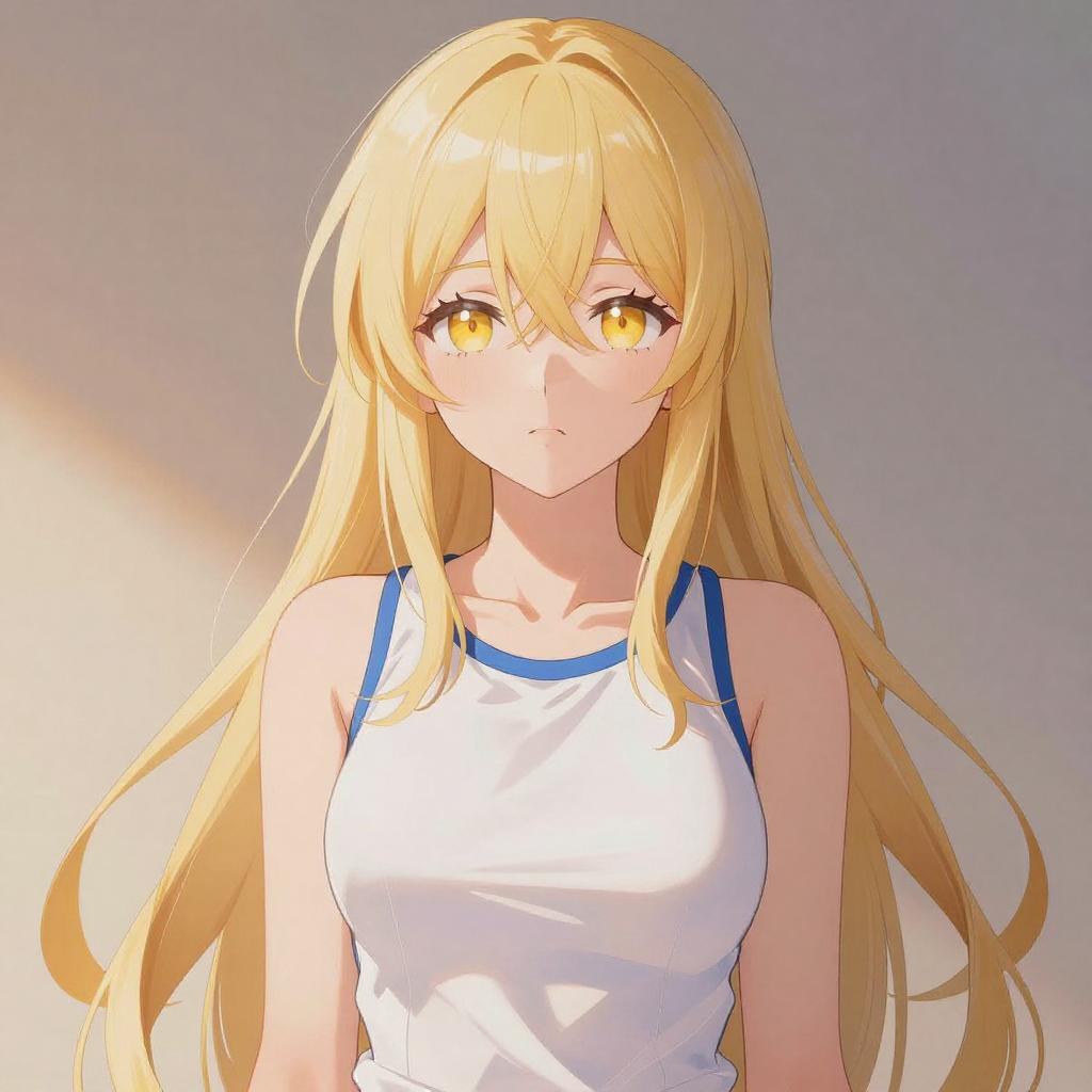 Illustration of a blonde anime girl with long hair and green eyes, wearing a white sleeveless top tied at the waist and denim shorts. She is sitting on a bed, showing fishnet stockings on one leg, with a playful and slightly blushing expression.