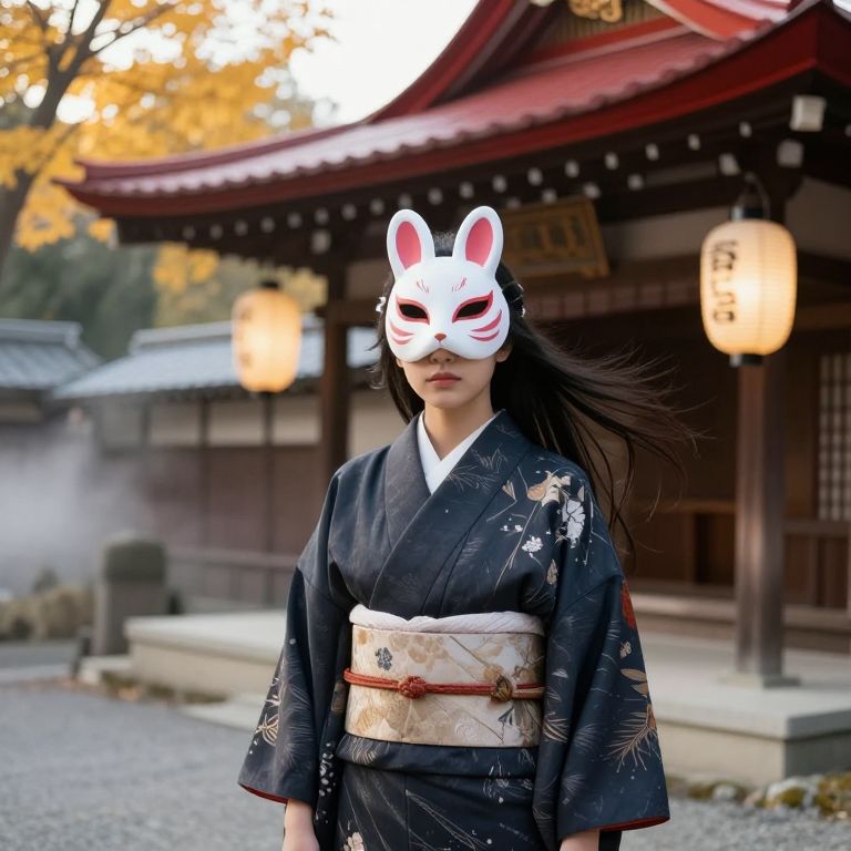 A person wearing a traditional Japanese kimono with a delicate rabbit mask adorned on their head, standing confidently in front of an ornate, ancient wooden building with red-tiled roof and paper lanterns in the background. The scene is set in a serene, slightly misty countryside during early autumn, with golden sunlight filtering through the trees. The person has long black hair flowing gently in the breeze and a calm, mysterious expression, blending traditional Japanese aesthetics with a touch of fantasy and cultural charm.