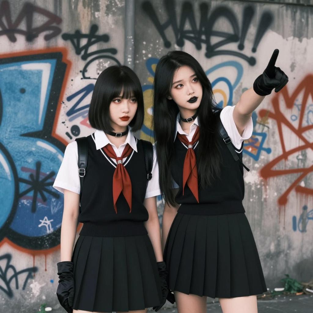 Photograph of two young Asian women in a gritty urban setting with graffiti-covered walls. Both wear black and white schoolgirl outfits with red neckerchiefs, black gloves, and chokers. The woman on the left has a bob haircut, pale skin, and red lipstick. The woman on the right has long black hair, pale skin, and dark lipstick, pointing upwards with her right hand. They stand close together, the woman on the left in front and slightly to the left, the woman on the right behind and to the right.