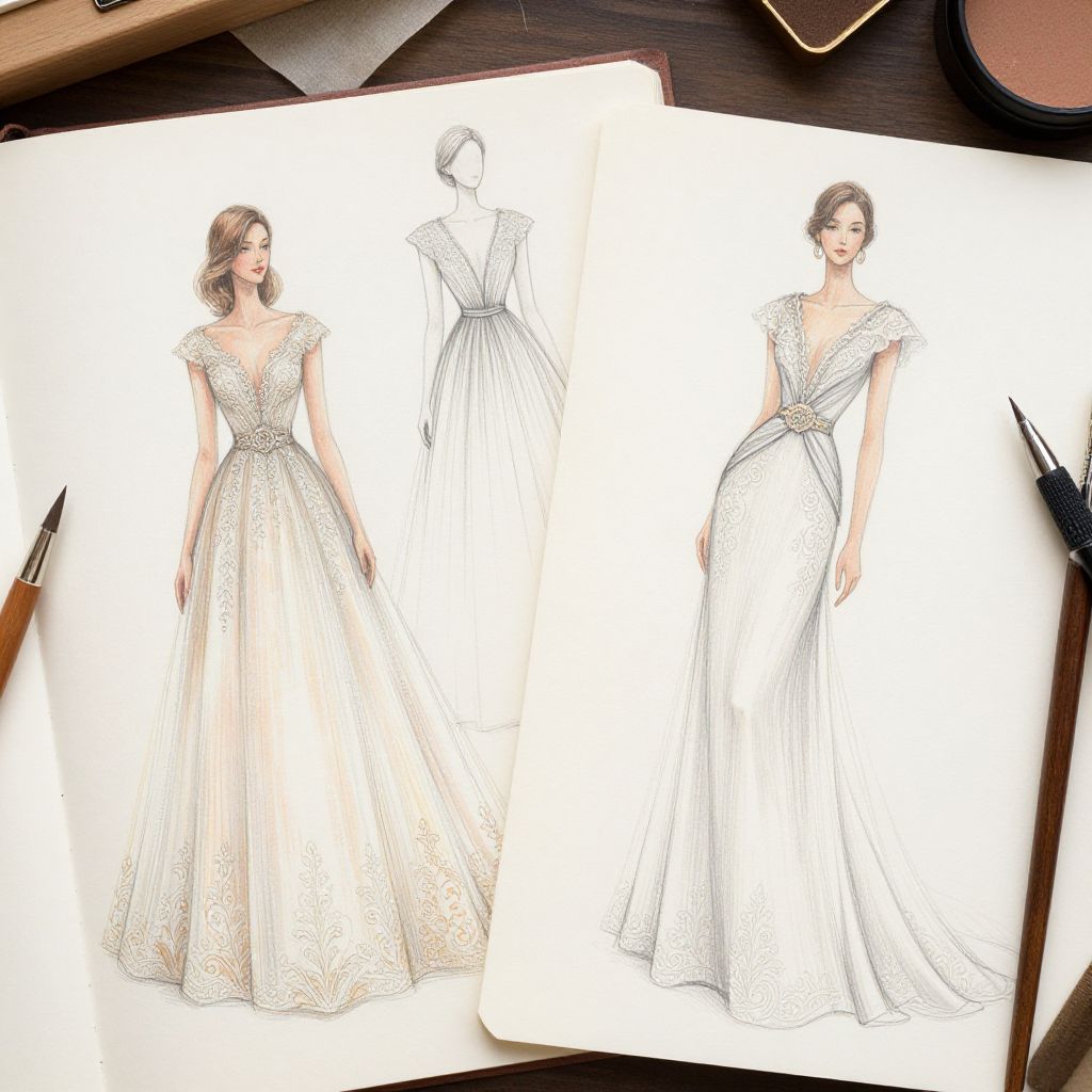 Model sketches showcasing haute couture gowns with delicate lace and embroidery details, graceful poses on sketchbook pages, fine linework and soft pastel highlights, vintage atelier aesthetic with artist tools and materials visible, elegant and refined presentation.