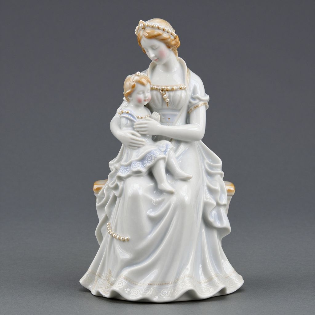 This photograph features a white ceramic figurine of a mother and child against a solid dark gray background. The mother, with fair skin and red hair adorned with a gold headband, wears a detailed, Victorian-style dress with gold accents and a pearl necklace. She cradles a small child, also with red hair, in her lap. The child is dressed in a simple, white outfit. The figurine has a smooth, glossy finish and gold highlights, particularly on the mother's dress and the child's hair. The mother gazes down lovingly at the child, who looks up at her. The background is plain, emphasizing the figurine's intricate details and elegant design.