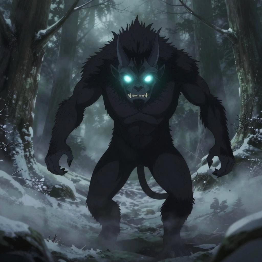 Wendigo anime creature emerging from icy shadows in a haunted forest, twisted limbs and glowing markings, mystic aura, detailed anime horror style illustration