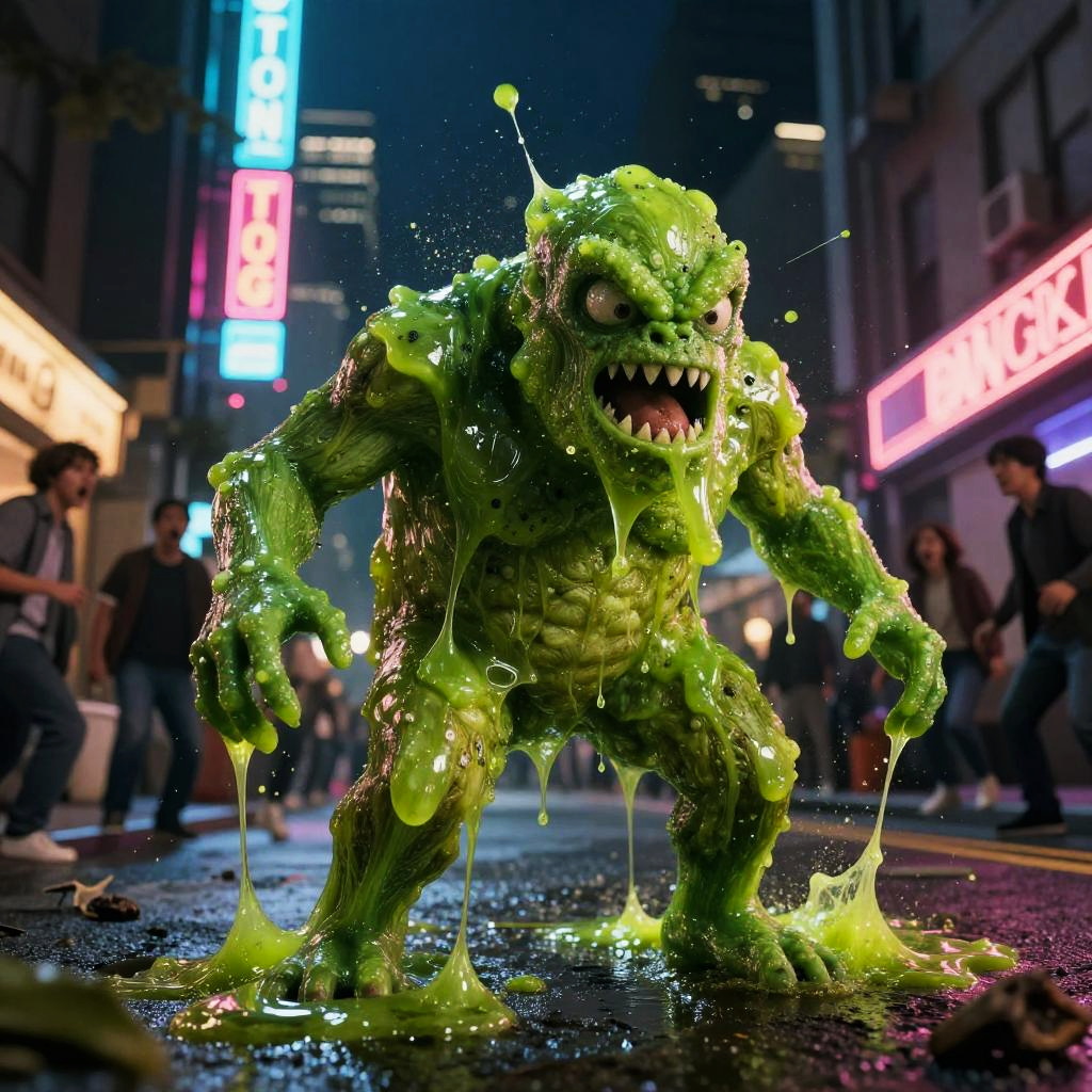 Green goo monster attacking a city street at night, slime splattering on buildings, chaotic scene with terrified people, neon lights reflecting off the monster's gooey skin, highly detailed