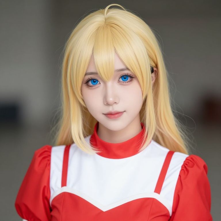 Girl with blonde hair and blue eyes wearing a blue and white outfit with a hood.