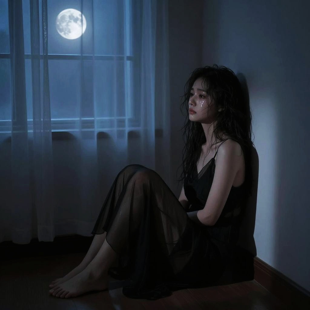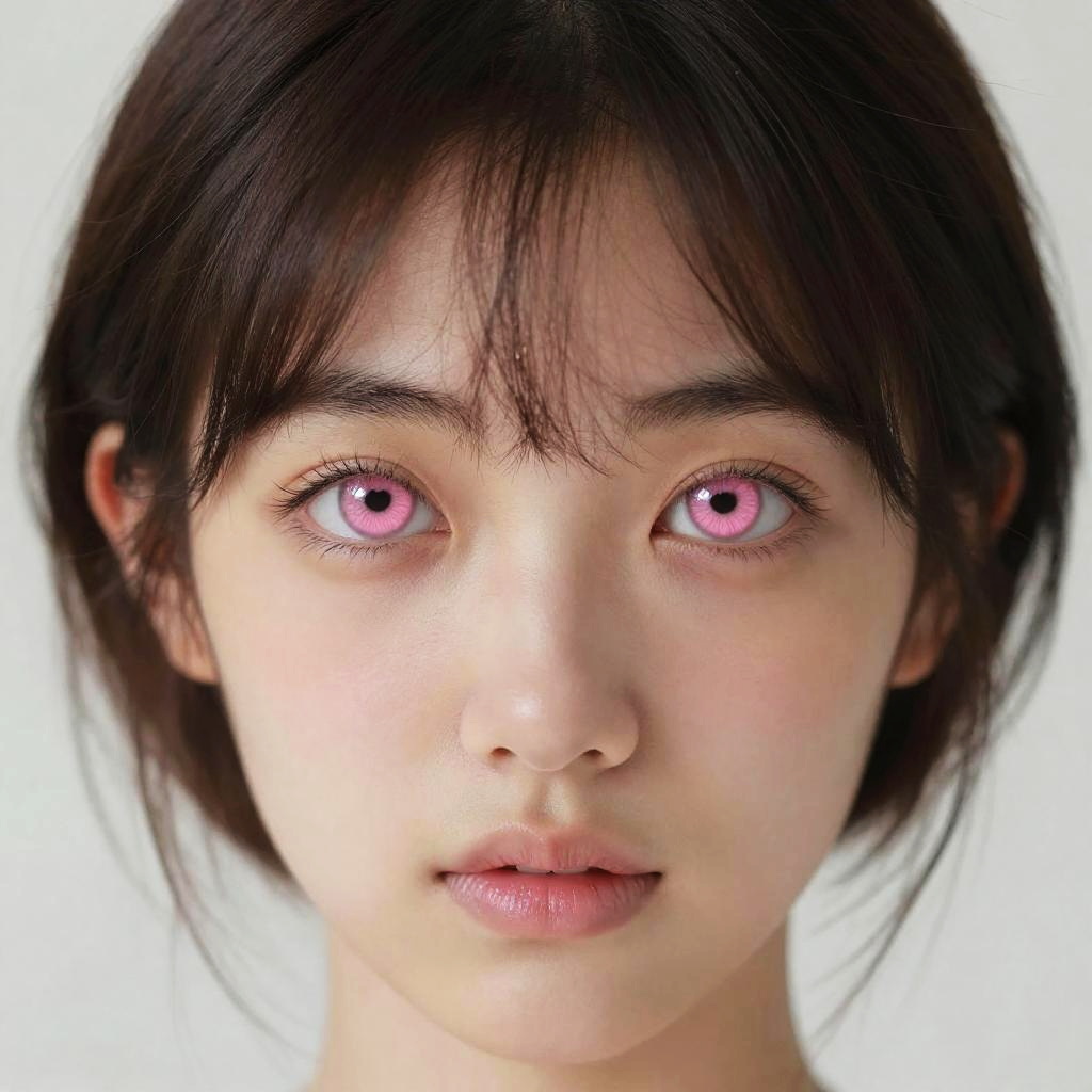 Close-up portrait of an Asian woman with striking white eyes gazing upwards with a red moon and stars visible in the dark night sky background. The image features soft, natural skin texture and hyperrealistic sharp focus, capturing the subject's serene and mysterious expression.