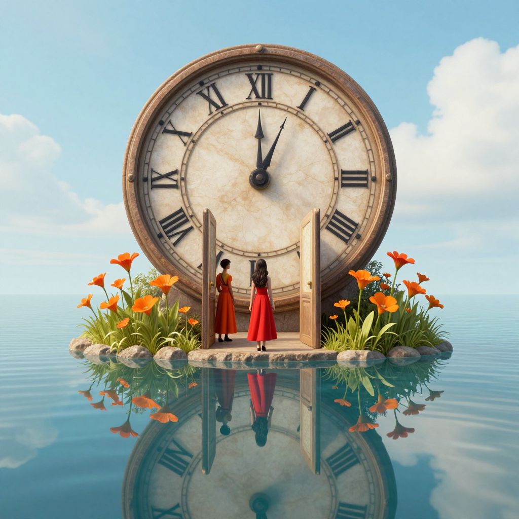 Digital artwork depicting two women standing before a large, rustic clock with Roman numerals, set on a floating island with orange flowers and greenery. One woman wears a red dress, the other a black dress, both with long hair. The clock is centered, with its reflection visible in the still, blue water below. The sky is bright blue with scattered white clouds. The overall scene has a surreal, dreamlike quality, emphasizing time and reflection.