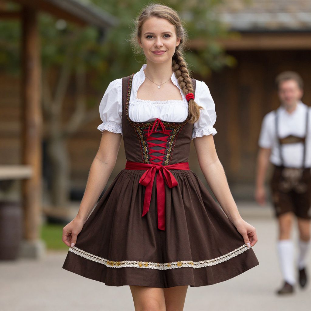 "Woman Traditional Oktoberfest Outfit Costume, woman in brown dress with red sash and white shirt"