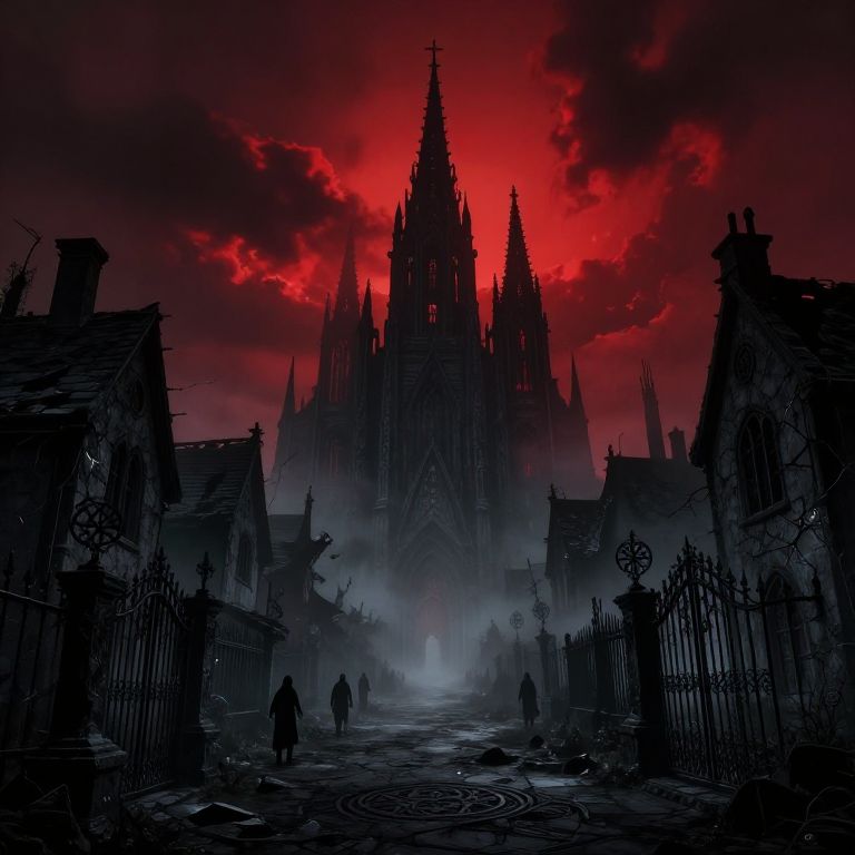 Dark fantasy town with towering blackened cathedral dominating the skyline, streets filled with shadowy figures and arcane symbols, decayed buildings with glowing cracks, eerie fog enveloping twisted iron gates, ominous red sky streaked with dark clouds, uneasy silence in the air.