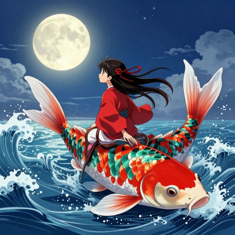 In this mesmerizing manhwa art style illustration, a young girl with long, flowing hair adorned with a red ribbon rides atop a majestic Koi fish, its scales shimmering with hues of green and red. The Koi, with its powerful tail and serene expression, glides gracefully through the turbulent sea, its fins cutting through the waves as it reaches for the luminous, full moon that hangs in the night sky. The scene is a harmonious blend of natural elements, with the girl's red kimono contrasting beautifully against the deep blue of the sea and the soft, cloud-like formations that drift in the background. The interplay of light and shadow, the intricate details of the Koi's scales, and the serene expression on the girl's face create a sense of tranquility and wonder, capturing the essence of a magical, otherworldly journey.