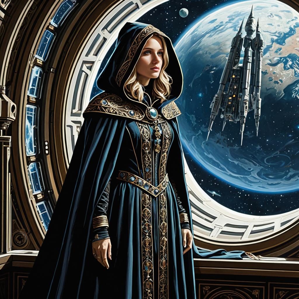 Digital illustration of a tall, thin woman wearing a detailed hooded and ornate cloak in front of a large space station window with a view of Earth and a futuristic spaceship. The artwork combines gothic and science fiction elements with intricate, elegant design in fine detail, inspired by artists like Greg Rutkowski and Alphonse Mucha.