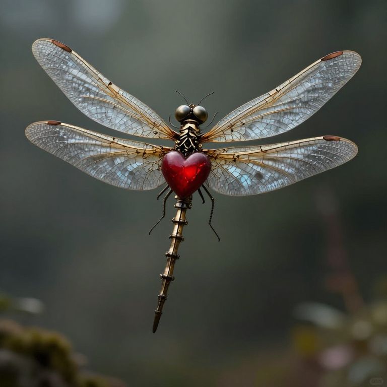 An ethereal steampunk dragonfly, adorned with intricate mechanical wings and a crimson heart, hovers serenely, its presence imbued with a paradoxical blend of freedom and melancholy, as if carrying the weight of forgotten dreams and untold stories.