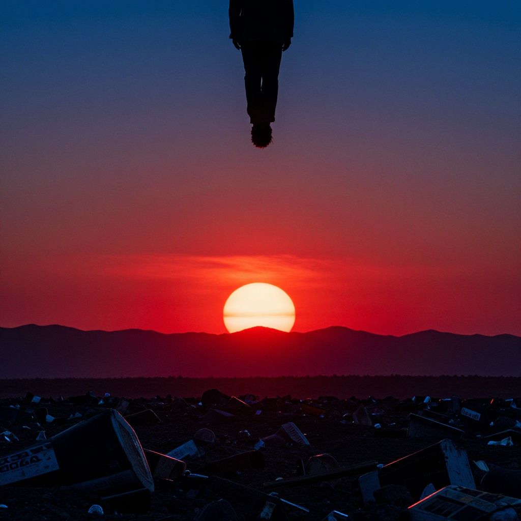 Photograph of a vivid sunset with a red-orange sky, silhouetted mountains, and a hovering motorcycle above a graveyard.
