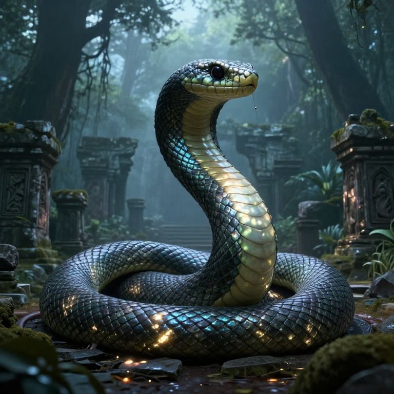 Coiling vibrant serpent weaving through enchanted forest, ethereal glowing scales shimmering under moonlight, detailed mystical atmosphere with swirling mist and ancient trees, high fantasy art style, intricate textures and dynamic motion