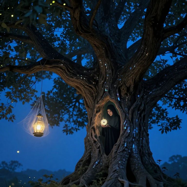 A mystical digital artwork depicts a hooded figure draped in a deep blue cloak, holding a glowing glass bottle that contains a miniature, warmly lit house surrounded by trees and twinkling stars, evoking a fantasy-inspired, high-definition scene where night's ethereal beauty is captured in a surreal, eternal moment.