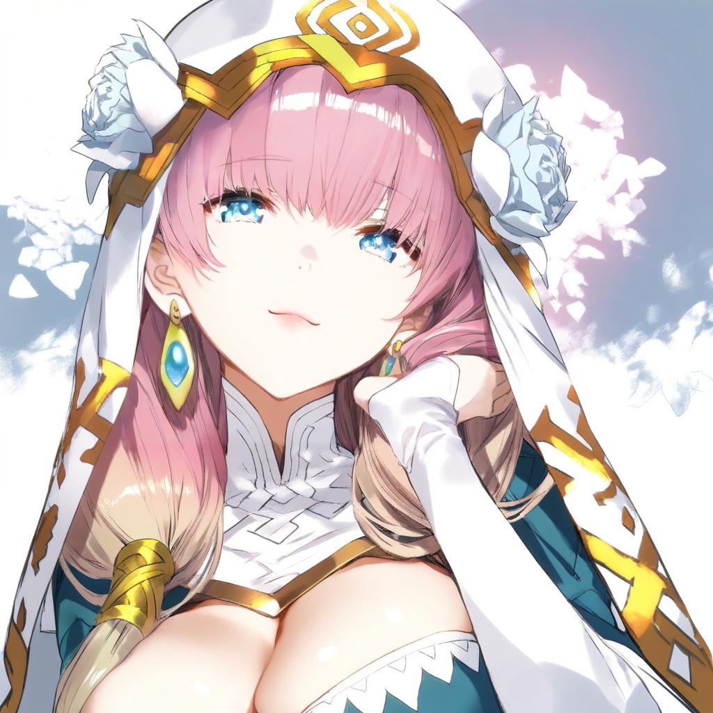Digital artwork of Gunnthra from the Fire Emblem series featuring a close-up of a female character with long gradient pink and blonde hair, bright blue eyes, and a detailed white and gold headpiece adorned with flowers. She wears elegant earrings and a costume showcasing large breasts and cleavage, with intricate designs and a fantasy theme.
