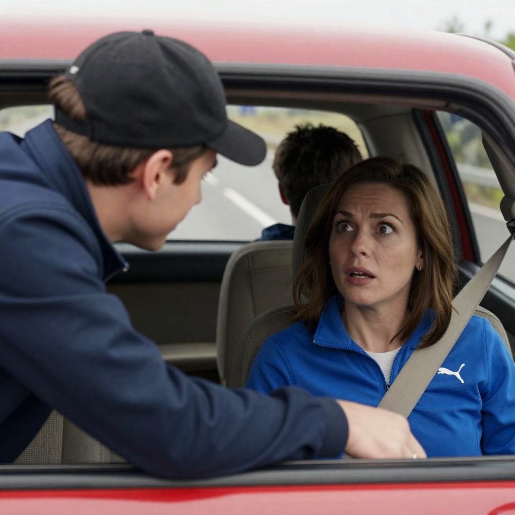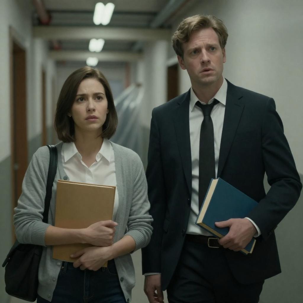 Photograph of a man and woman standing outdoors. Man in yellow high-visibility vest, light blue shirt, short brown hair, open mouth, raised hands. Woman in navy blazer, beige shirt, short brown hair, concerned expression, hands on head. Green leafy background. Man on left, woman on right. Both looking towards camera.