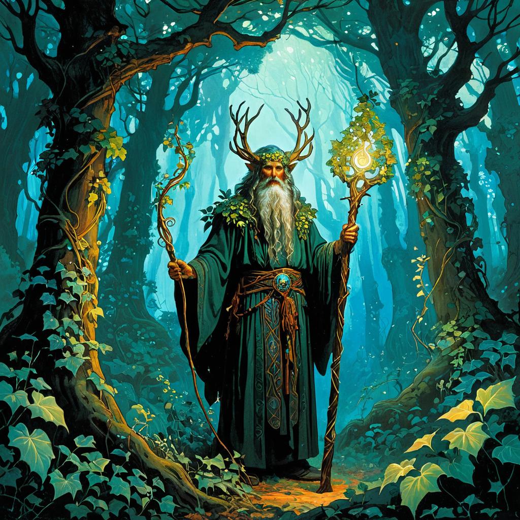 Full-body digital painting of a mystic forest druid standing in an ancient, mist-covered grove. The druid, clad in a green robe adorned with vines and leaves, holds two staffs entwined with glowing ivy and bioluminescent elements. The scene is rich with detailed forest flora, illuminated by a vibrant, magical canopy. The artwork combines fantasy themes with a smooth, sharp focus style reminiscent of Alphonse Mucha and Michael Whelan.
