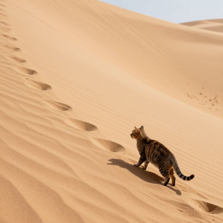 Photograph of a tabby cat with a striped coat and a black-tipped tail, walking through a vast, sunlit desert of golden sand dunes. The cat, positioned slightly to the right, has a focused expression and is leaving small paw prints in the soft, undulating sand. The bright sunlight casts sharp shadows, emphasizing the texture of the dunes and the cat's fur. The background is a clear, pale blue sky, creating a stark contrast with the warm, golden tones of the sand. The cat's shadow trails behind it, adding depth to the image.