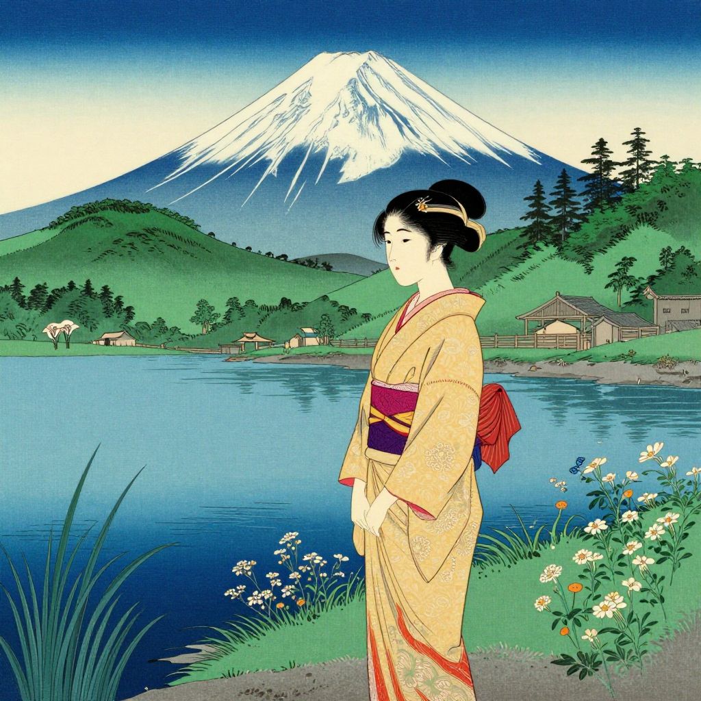 Woman in traditional kimono stands gracefully by a serene lake, her gaze directed toward majestic Mount Fuji, framed by lush green hills and delicate wildflowers in a classic Japanese woodblock print by Takeji Asano.